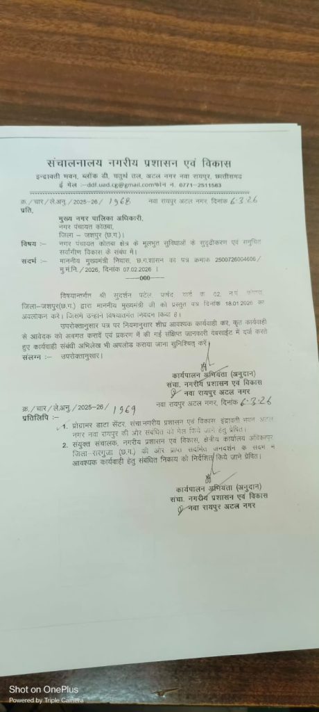 ताजा दस्तावेजों के अनुसार, संचालनालय नगरीय प्रशासन एवं विकास नवा रायपुर ने 6 मार्च और 10 मार्च 2026 को मुख्य नगरपालिका अधिकारी, कोतबा को पत्र जारी कर मांगों पर शीघ्र आवश्यक कार्रवाई करने के निर्देश दिए हैं। विभाग ने स्पष्ट कहा है कि की गई कार्रवाई की जानकारी आवेदक को देने के साथ-साथ उसका संक्षिप्त विवरण जनदर्शन पोर्टल पर भी अपलोड किया जाए।