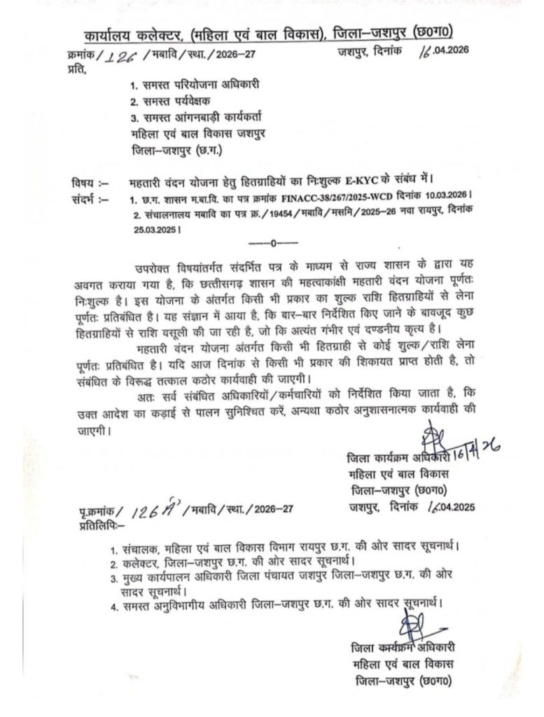 जिला प्रशासन जशपुर द्वारा महतारी वंदन योजना के अंतर्गत हितग्राहियों के लिए E-KYC प्रक्रिया को पूरी तरह निःशुल्क घोषित करते हुए किसी भी प्रकार की राशि वसूली पर सख्त प्रतिबंध लगा दिया गया है। इस संबंध में महिला एवं बाल विकास विभाग, जशपुर द्वारा स्पष्ट निर्देश जारी किए गए हैं।
