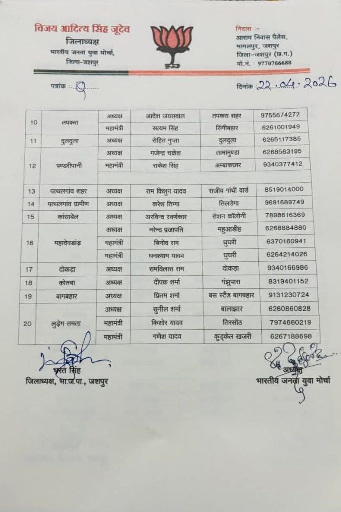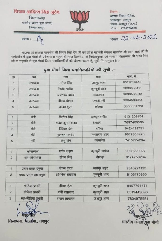 भारतीय जनता युवा मोर्चा की जिला इकाई में नई टीम का गठन किया गया है, जिसमें कोतबा क्षेत्र के युवाओं को महत्वपूर्ण जिम्मेदारियां सौंपी गई हैं। इस नियुक्ति में कोतबा के अजय को जिला उपाध्यक्ष बनाया गया है, वहीं दीपक शर्मा को मंडल अध्यक्ष का दायित्व दिया गया है।